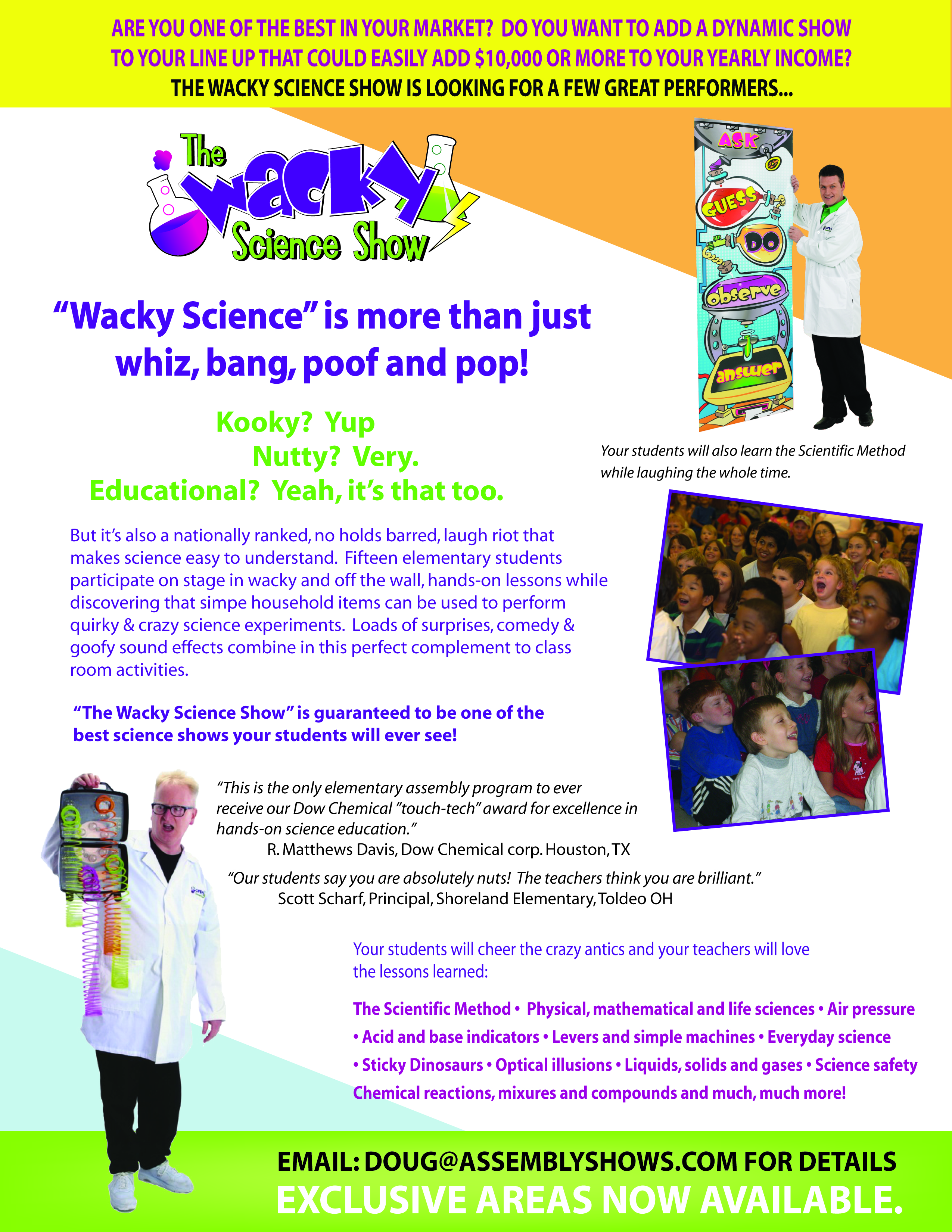 Are you looking to expand your offerings, increase your income, or branch out a little as a kid show performer? Scheer Genius Assembly Productions is making complete shows available for licensing in your area. The Wacky Science Show is our first venture.